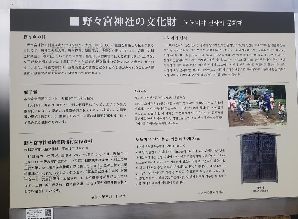 当社は高麗川に、入間の野々宮神社は不老川に、鴻巣の野々宮神社は荒川にと、それぞれ川辺に鎮座し、祀職は祓の伝承地日向出身と伝えている、以上のことは野々宮神社が“祓の社”としての役割を持っていることを物語るものであろう。