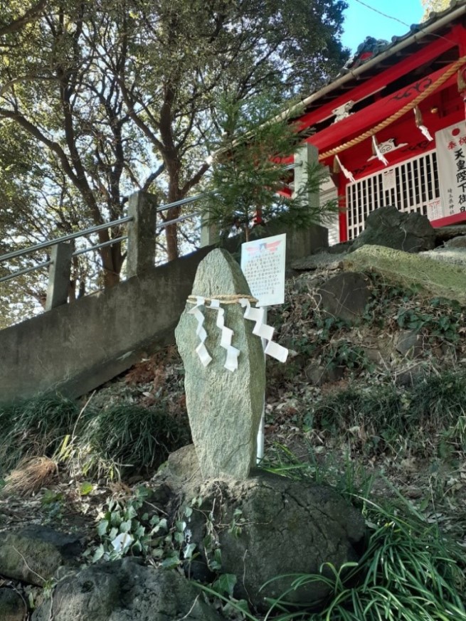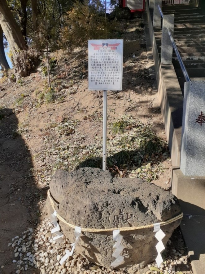 石段前左側に注連縄で祀られている 石段途中の右側に祀られている