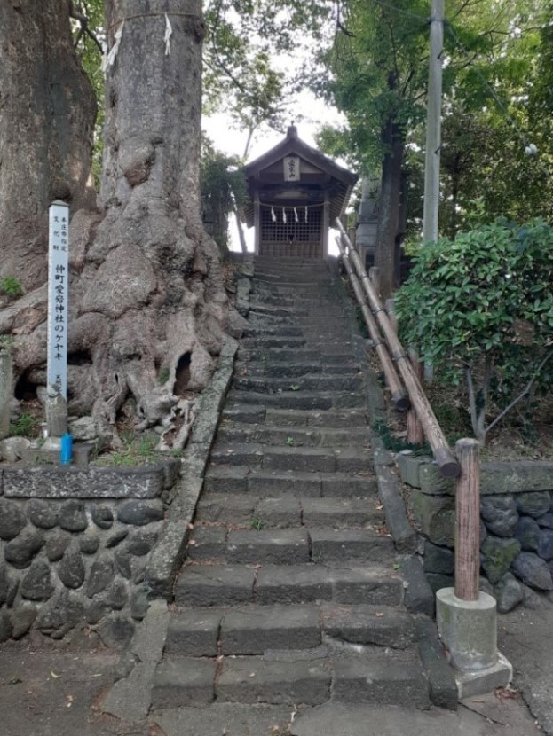 参道を進み、石段を下るその先に社殿等が見えてくる。