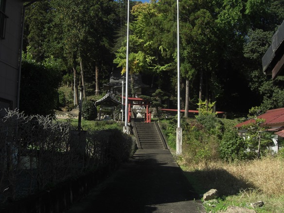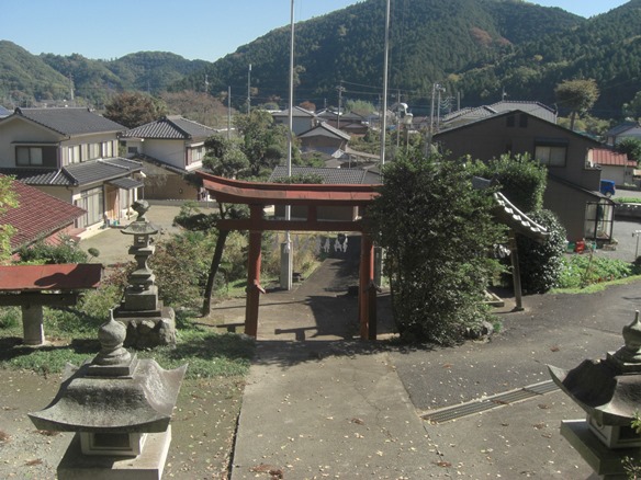 一の鳥居を過ぎ、静かな山村の風景が参道の周りに見られ、気持ちも落ち着き、心地よい時間が流れる。 参道を歩いていくと、山の斜面上に社の社叢が見えてくる。