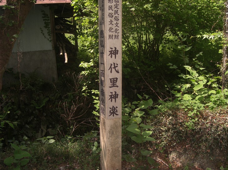 一の鳥居の手前には「神代里神楽」と記された標識があり(写真左)、一の鳥居の先ですぐ左側には神興庫(同右)がある。