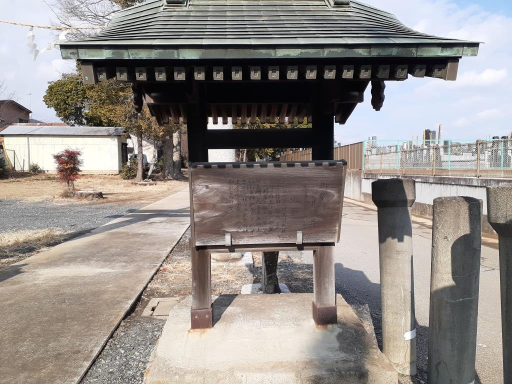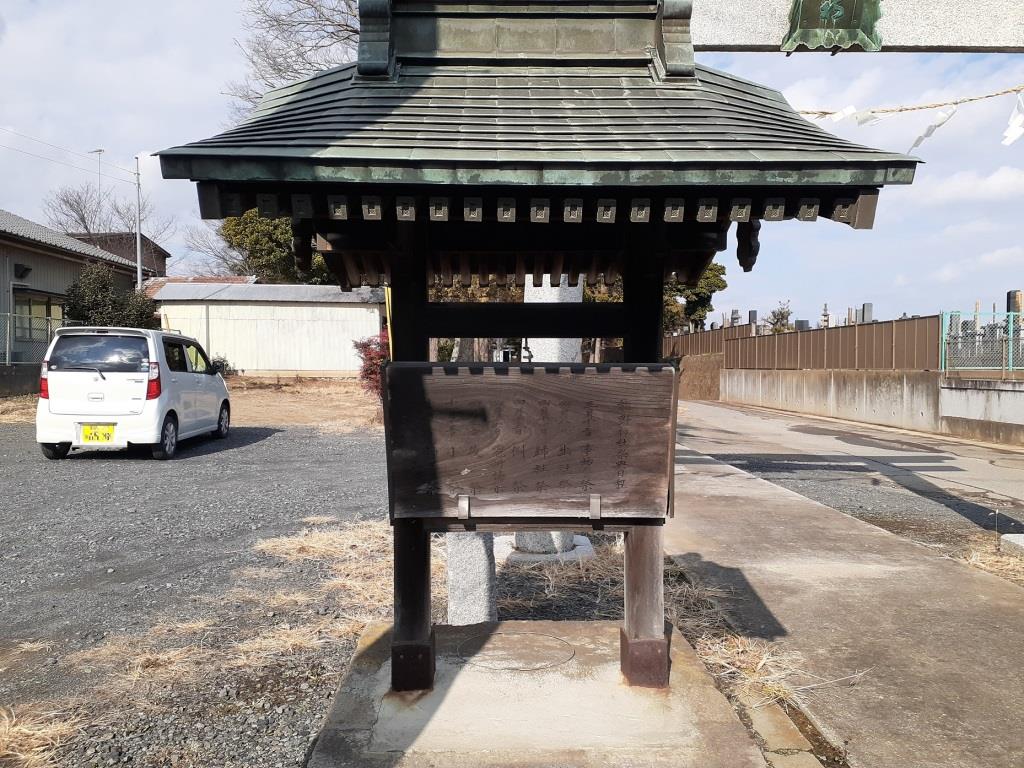 鳥居手前左側にある祭典日程を記した案内板 鳥居手前で右側にある由来を記した案内板
