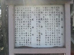 今から五百有余年前の康正二年上杉房憲氏が深谷城を築造するにあたり、重臣秋元越中守の進言により城地鎮護の守護神として天地開闢の尊神、国常立尊を奉斎して城内に御嶽社を祀る。その尊厳神域はいつか城跡と共に、人々の念頭から去り荒廃その極みに達し年度の祭祀をすることさえ能わず、明治三十八年勅命により之を瀧宮神社の末社に遷座する。昭和九年深谷小学校新築敷地になり現在小学校東端の塚はこの所である。昭和二十六年GHQの神道指令により「ツゲ」の古木に神秘を留めた御嶽神社を百日潔斎の修法の下に、瀧宮神域に本殿拝殿を建設し奉斎遷座して五十一年。以来信奉者は日に日に増し霊験次々と顕れ普く御神徳を浴するものが多くありました。しかし平成十四年一月二十六日、心無い何者かによる不祥事で神社を焼失してしまいました。火災の折には、瀧宮神社、近隣の皆様をはじめ信奉者各位に多大のご迷惑をおかけしましたが、温かくその後の再建に物心両面でご協力を頂きましたことが再建の励みとなりました。以来信奉者の方々から早く再建をとの声が高まり、御嶽神社再興の主旨をご理解いただき多くの方々に過分なる御浄財の奉納を賜りました。お蔭様で茲に立派な本殿、拝殿を完成することが出来ましたので皆様の御篤心に感謝申し上げ記念碑を建立致します。