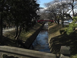 唐沢川をはさんで南側に鎮座する 春の唐沢堤は桜で満開になる。深谷市では有名だ
