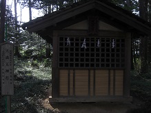 荒神社近くの林の中の道には、「楡山」と刻印された旧拝殿の鬼瓦と説明書がある。