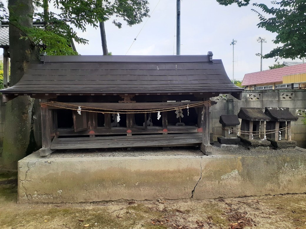 社殿右側奥に鎮座する合祀社、石祠群。 合祀社・石祠群の右並びに石碑、祠群が鎮座。
