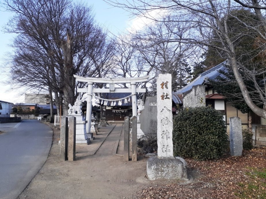 當八幡神社は昭和三十四年九月二十六日の伊勢湾颱風の余波を蒙り本殿外宇及び拝殿に大災害を受け氏子一同驚愕と悲嘆の極に達した。このままに放置することは一刻と雖も忍びざるところ即日對策を協議した結果満場一致社殿の再建をなすこととし直ちに建築委員会を組織した。抑々當社は明治三十三年五月當時の氏子三十一戸総代根岸悌三郎根岸傳次郎柿沼久作建築委員代表石丸茂十郎棟梁柿沼百太郎各氏の努力と氏子の協力に依り本殿外宇は間口二間奥行二間半木造茅葺又拝殿は間口八尺奥行六尺木造瓦葺にて造営され氏子の尊崇の中心として今日に及んだ。たまたま昭和二十九年旧三尻村が熊谷市合併に際し字所有の新堀新田字赤土二二ノ一外二筆山林一反九畝十一歩は市の財産となったのを地元市議会議員浅見一郎湯本春吉両氏の盡力により上記の土地無償拂下げを熊谷市長に嘆願し一方市議会にも折衝した結果格別の温情を以て金壹封を當字に交付された。この意義ある金圓の處分に付き区長は区民に諮ったところ満場一致これが社殿の建築資金に充てることにした。更に昭和三十五年二月宮司及び主任総代神社本廰に封し社殿建築資材として立木伐採許可申請をなしたるところ許可を得直ちに起工又工事に要する人夫は総て氏子総意の勤労奉仕に依り茲に芽出たく竣工を見るに至った次第である。