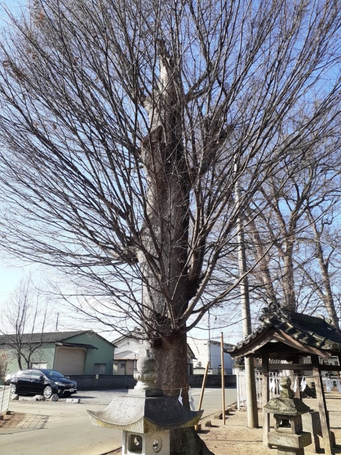 社殿左側で、道路沿いに聳えたつ御神木