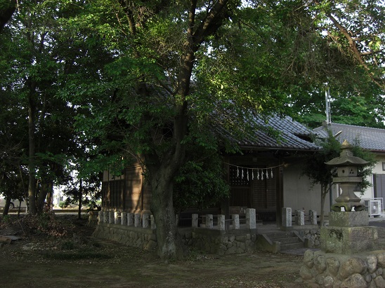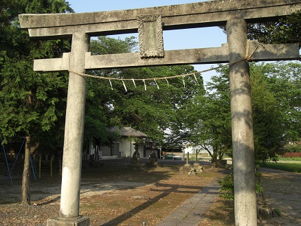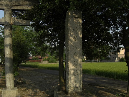 鳥居の横にある社号石標 鳥居から境内を撮影。社殿は横を向いている。