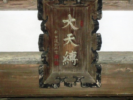 西城神社拝殿内部(写真左)とその上部に掲げてある社号額に記されている「大天獏」(同右)