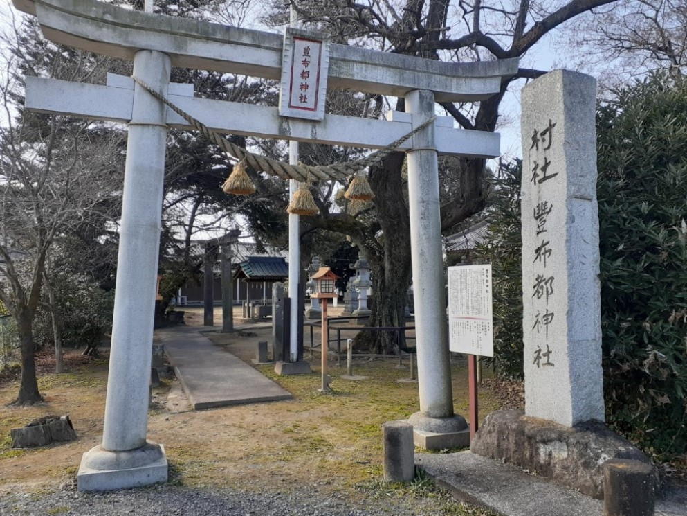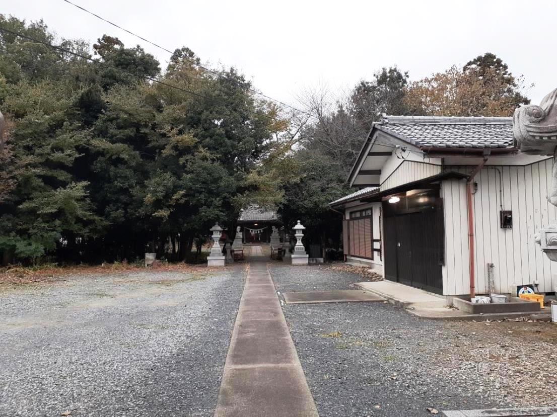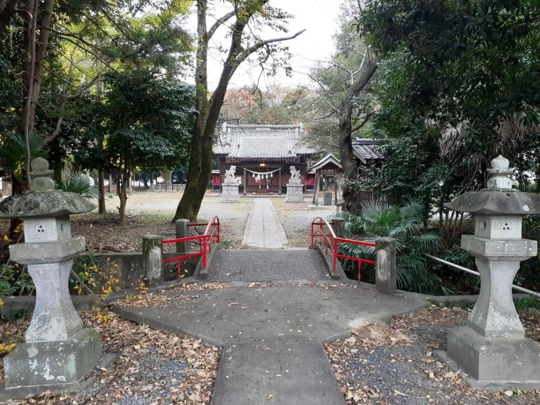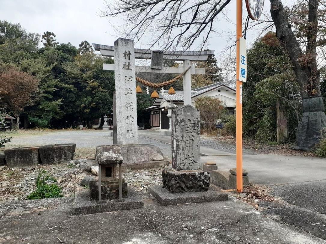 地形を見ると、当社は西城地区の東端に位置し、すぐ北側には福川が県道に並行して流れている。その自然堤防上に鎮座している模様。