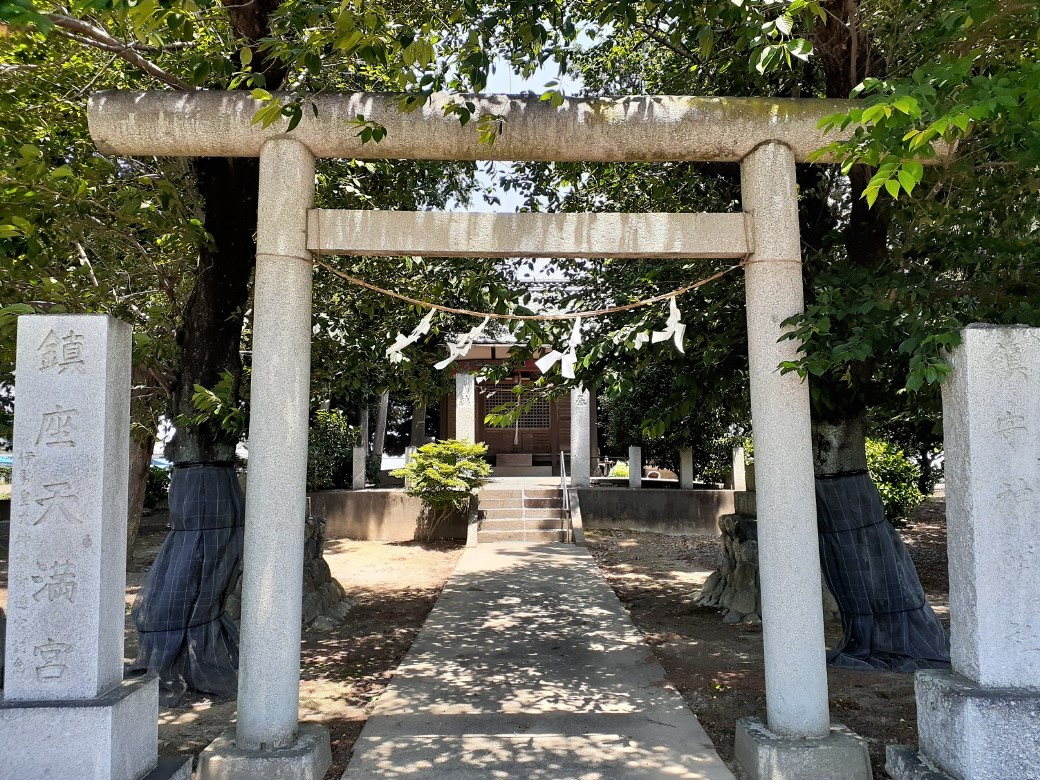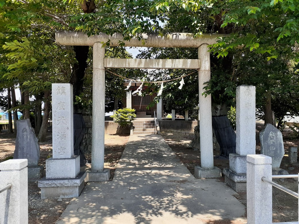 鳥居の左右に社号標柱が建てられており、左に「鎮座天満宮」、右に「鎮守神明社」とある。