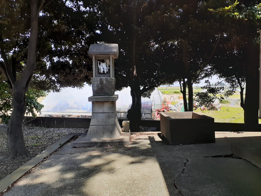 見ずらいが拝殿右側には境内社が鎮座する。 社殿左側裏には石祠。やはり詳細不明。