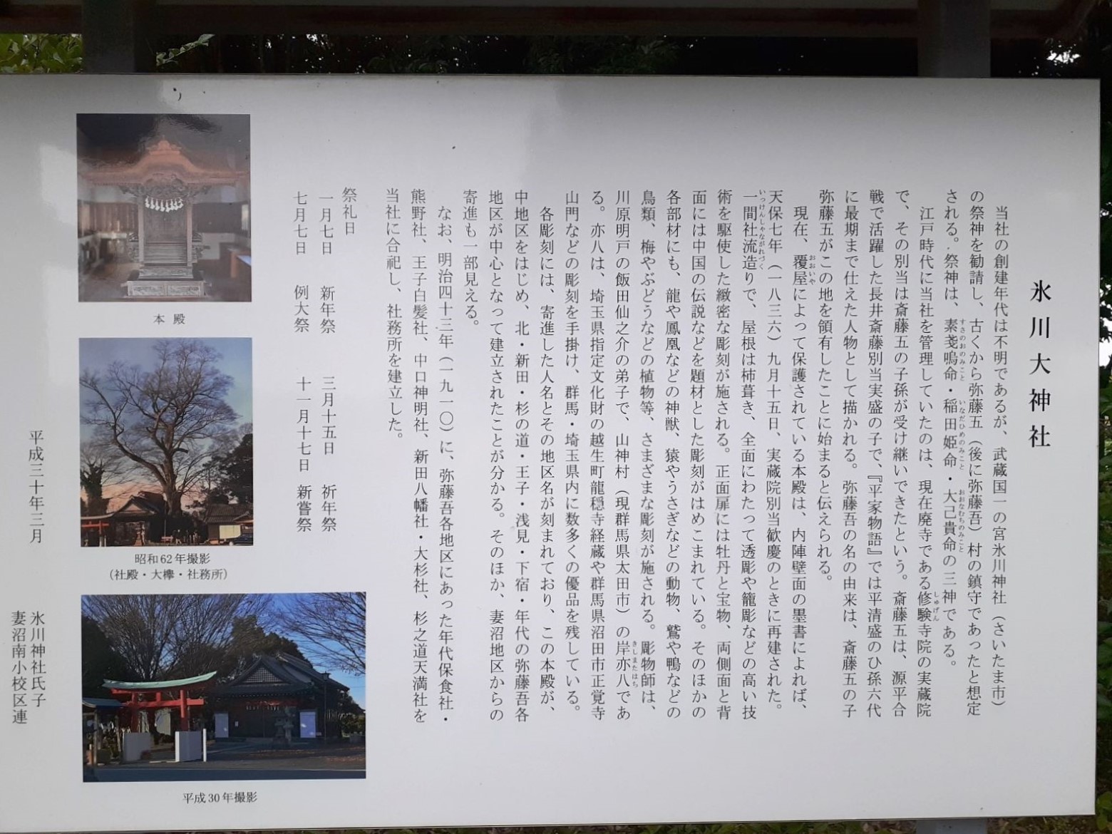 『地域計画事業』を実施するにあたり実施したアンケートの中で、『弥藤吾の伝統・文化を知る機会がない』との回答が多くあったので、妻沼南小学校区連絡会では氷川大神社についての説明看板を設置したとの事。