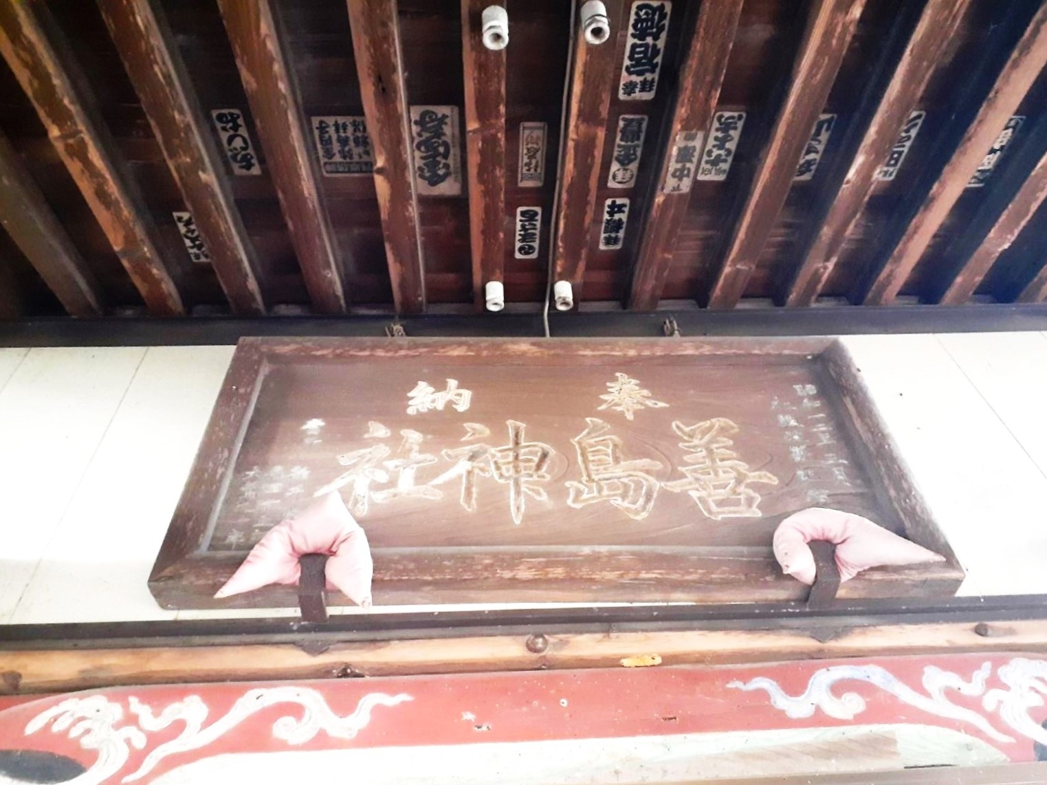 各彫刻には、寄進した人名とその地区名が刻まれており、この本殿が、中地区をはじめ、北・新田・杉の道・王子・浅見・下宿・年代の弥藤吾各地区が中心となって建立されたことが分かる。そのほか、妻沼地区からの寄進も一部見える。