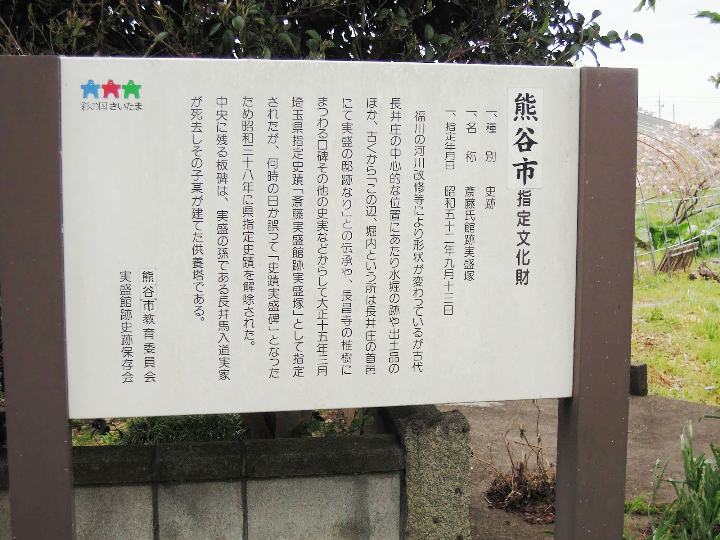 福川の河川改修等により形状が変わっているが古代長井庄の中心的な位置にあたり水堀の跡や出土品のほか、古くから「この辺、堀内という所は長井庄の首邑にて実盛の邸跡なり」との伝承や、長昌寺の椎樹にまつわる口碑その他史実などからして大正153月埼玉県指定史蹟「斎藤実盛館跡実盛塚」として指定されたが、何時の日か誤って「史蹟実盛碑」となったため昭和38年に県指定史蹟を解除された。