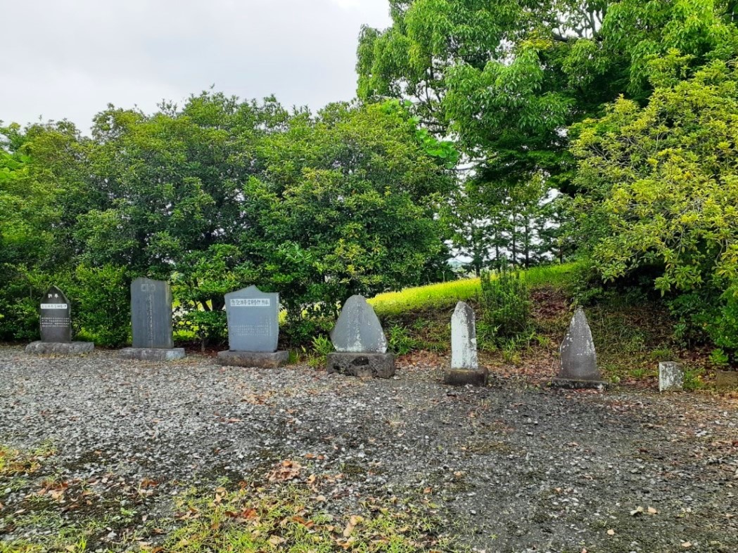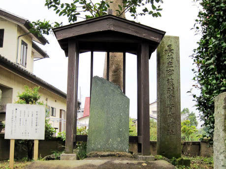 中央に残る板碑は、実盛の孫である長井馬入道実家が死去しその子某が建てた供養塔である。