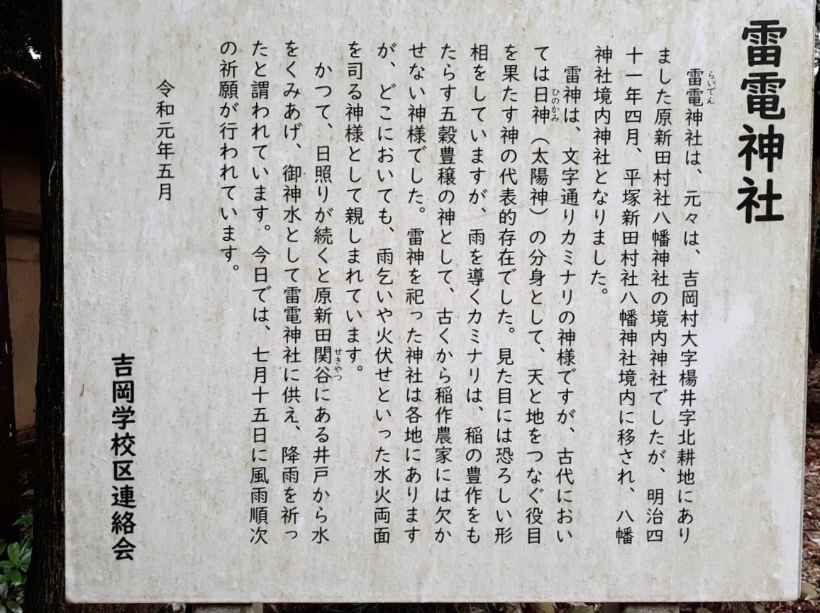 雷電神社は、元々は、吉岡村大字楊井字北耕地にありました原新田村社八幡神社の境内社でしたが、明治四十一年四月、平塚新田村社八幡神社に移され、八幡神社境内神社となりました。