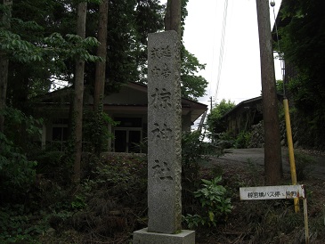 椋神社裏にあった昭和16年に建てられた社号標 奥にある建物の前に駐車