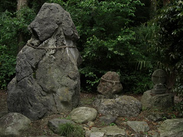 拝殿の右側にある陽石 社殿の左側にある境内社の鳥居と境内社群