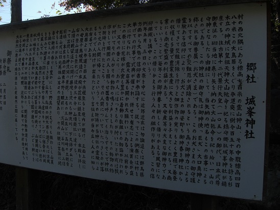 鳥居のある石段を過ぎると城峰神社の由来を記した案内板がある。