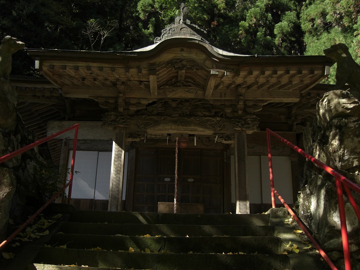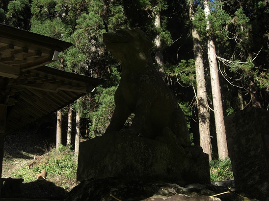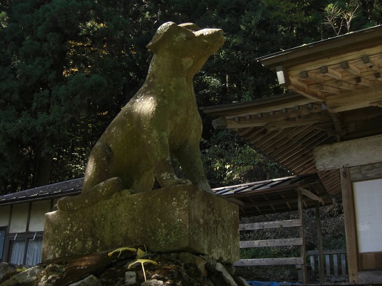 社殿に通じる石段を登り切るとその両側に日本武尊にちなむ山犬(狼)型の狛犬(写真左、右)が控えている。