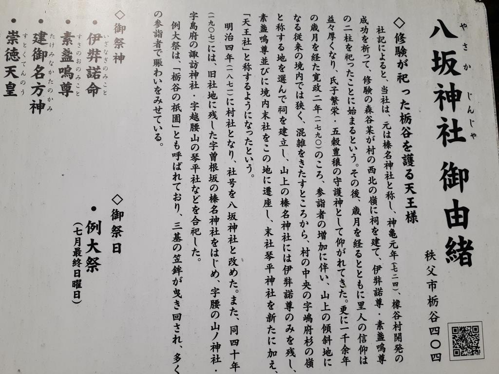 皆野町三沢八幡大神社から埼玉県道82号長瀞玉淀自然公園線を南下すること2㎞程、進行方向右手に「秩父三十四ヶ所観音霊場札所一番 四萬部寺」の駐車場が見え、そこを通り過ぎた直後のY字路を右折すると、すぐ右側に栃谷八坂神社が見えてくる。地図を確認すると四萬部寺とは隣接している位置関係にあるといえよう。