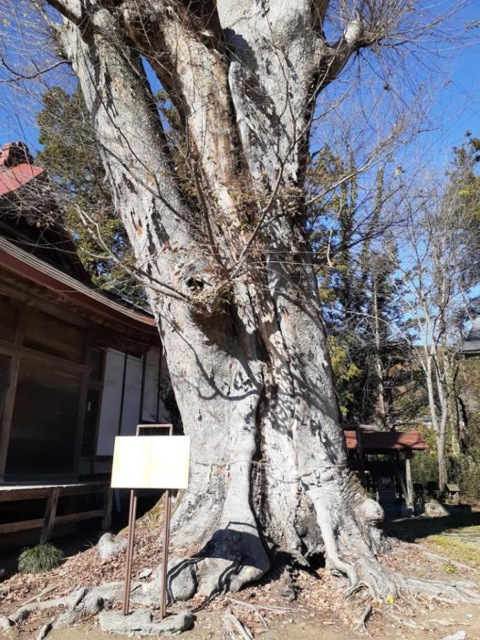 四方に伸びる枝張りの構成もみごとで、目どおり六米四十糎、樹高三十五米、枝張り二十五米もあり、地表十米附近より六本の枝にわかれています。
