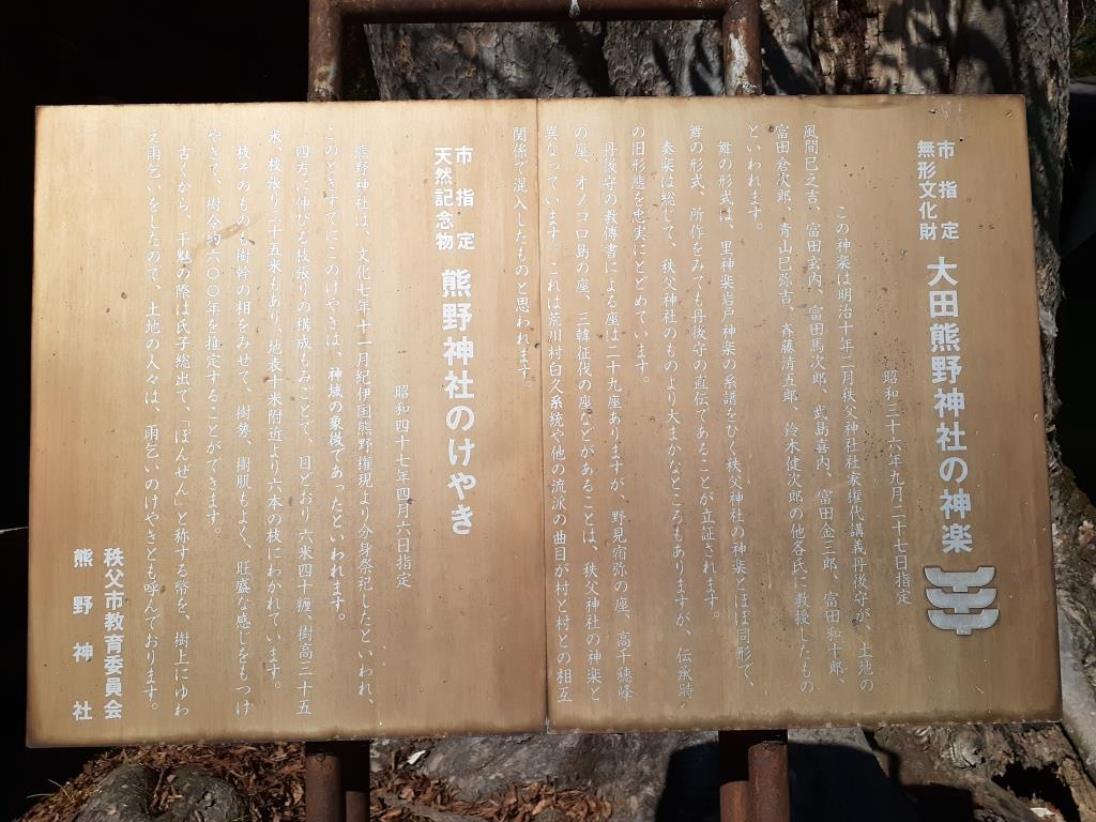 市指定天然記念物 熊野神社のけやき」と共に「市指定無形文化財 大田熊野神社の神楽」も掲示されている。「熊野神社のけやき」は上段を参照。