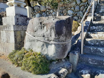 石段の手前、左側に注連縄が巻かれ祀られている   石段手前で右側には社の案内板あり。