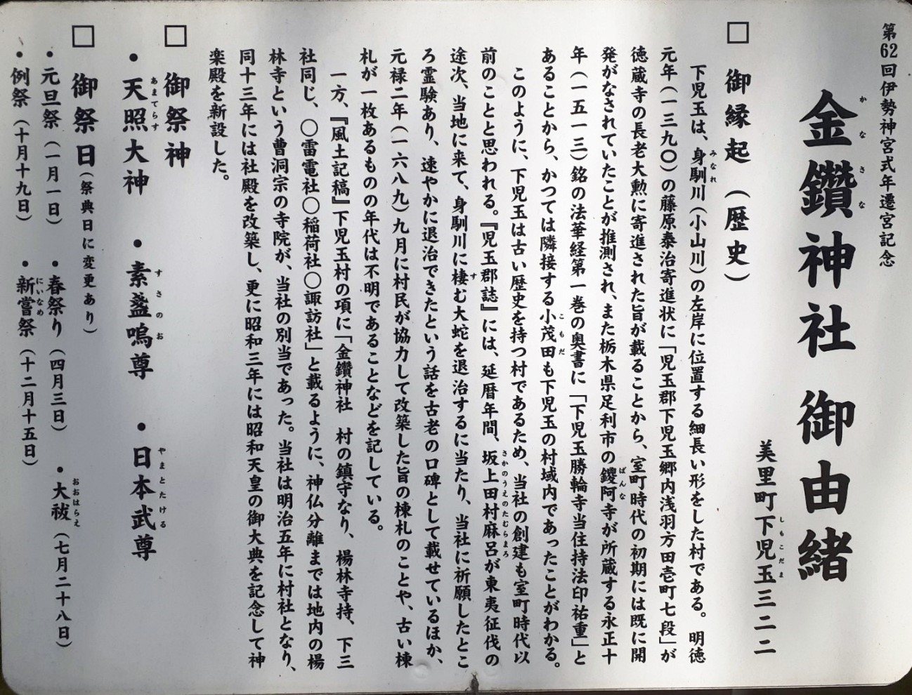 一方、「風土記稿」下児玉村の項に 「金銭神社 村の鎮守なり、楊林寺持、下三社同じ、雷電社・稲荷社・諏訪社」と載るように、神仏分離までは地内の楊林寺という曹洞宗の寺院が、当社の別当であった。当社は明治五年に村社となり、同十三年には社殿を改築し、更に昭和三年には昭和天皇の御大典を記念して神楽殿を新設した。(以下略)