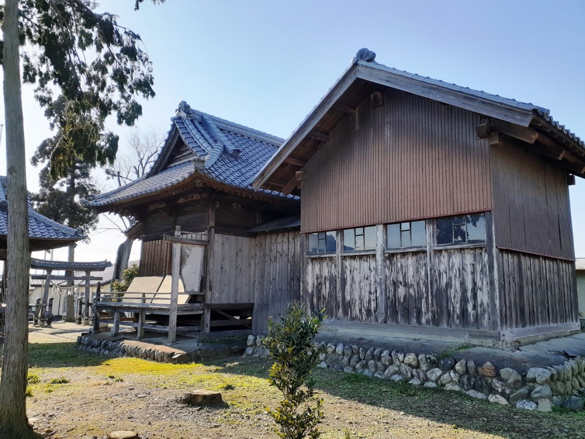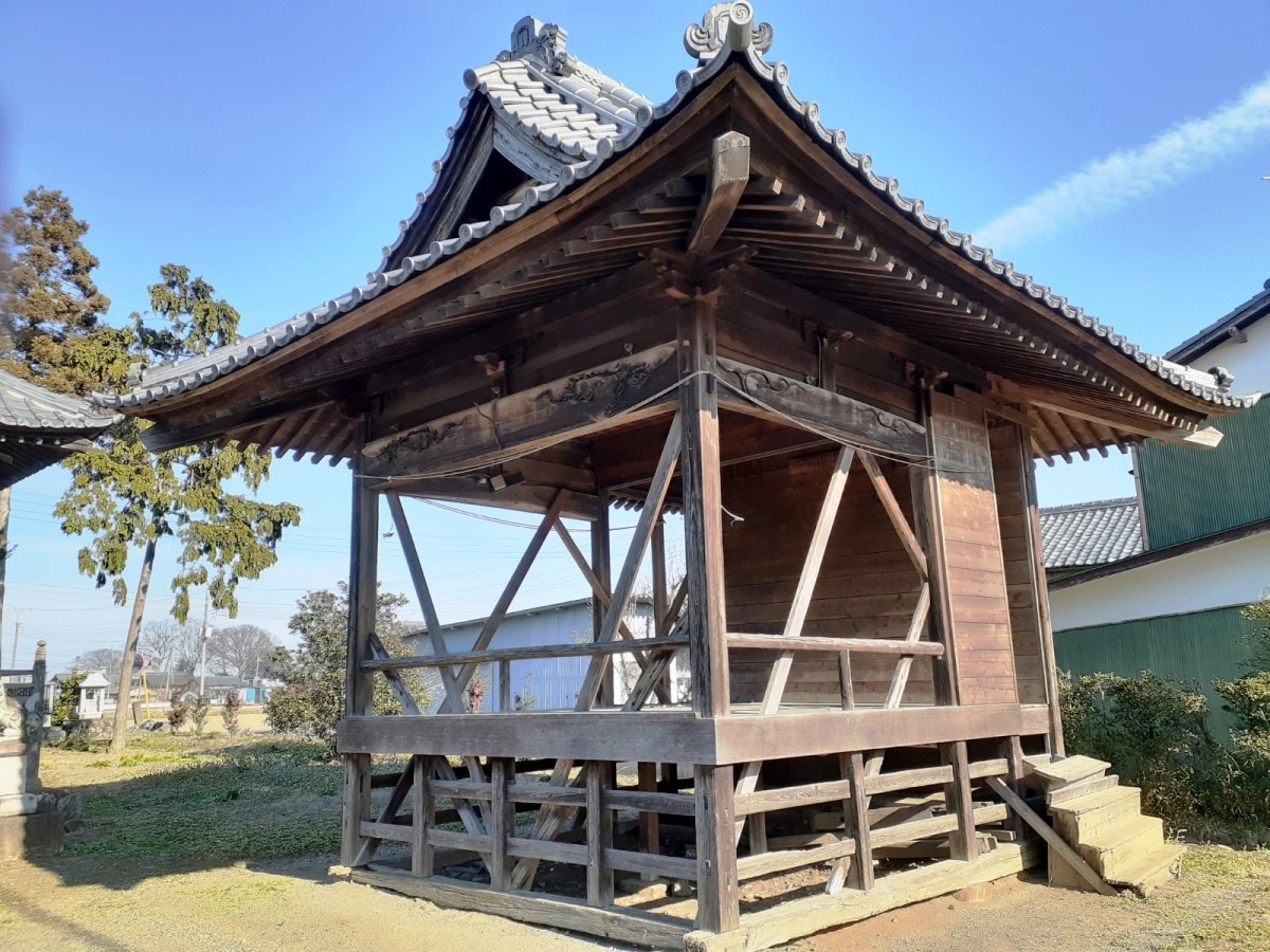 参道を進みすぐ右側に神楽殿がある。柱の間に斜めに伸びている筋交(建築物や足場の構造を補強する部材 )が正面、両脇に見える。構造上下部が安易な構造で上部の瓦の重みを支えきれないためだろう。