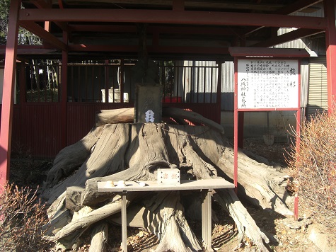 社殿の左側には神興庫があり(写真左)、通常は閉まっているのだが、正月初詣の関係で開いていたのは正直幸運だった。また並びにある社務所の手前には「熊杉」という大きな切り株がある(同右)。樹齢は約700年で世良田八坂神社のシンボル的な神木だったそうだが、今は切り株のみだ。