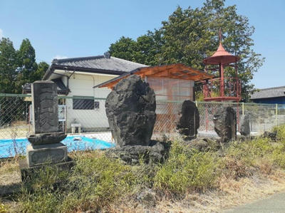 「稲荷神社由緒」前に石尊大権現と道祖神 「稲荷神社由緒」奥にある力石と石碑