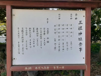 社殿の左側に設置されている社の簡単な案内板 社殿の右側にある「三柱神社 新築記念碑」