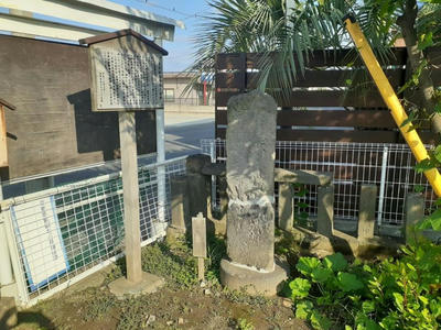 元は下武士萩原と境の境界付近、現在の国道三五四号の分岐点に建てられていたものが、明治はじめに諏訪神社に移されました。丸い台石には、十二支と東西南北の方向が刻まれ、その上に台形の塔身が載っています。正面に「日光木崎太田道」、左面に「五料高さき道」、右面に「いせさき 満(ま)やむし道」(前橋)とあることから、元あった場所では、東側に向いていたと考えられます。