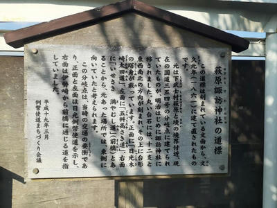 境内に入ったすぐ左手隅にある「萩原諏訪神社の道標」(写真左)とその案内板(同右)