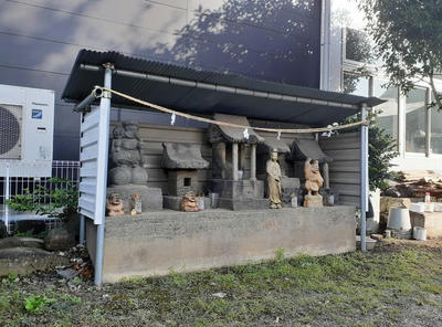 参道途中、左側に祀られている石祠群と大黒様等 参道右側には縁起に関する案内板あり