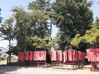 衣笠稲荷社や石祠が祀られている幟と木々に囲まれた一角
