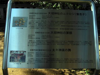 後日案内板等で知ったことだが、この社は大胡城北端の堀切に囲まれた近戸曲輪にある。城主大胡常陸介高繁が、天正17年(1589年)三夜沢赤城神社より勧請し、大胡城の守り神とした。毎年5月3日の祭典に太々神楽(市指定重要無形民俗文化財)が奉納される。また、大正4年の算額(市指定重要文化財)とムクロジ(市指定天然記念物)の神木がある。明治42年(1909)旧町内の22社を合祀したという。