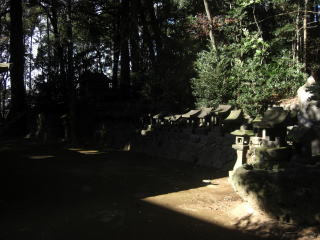 社殿の奥に並んで鎮座している境内社、末社、石祠類。詳細不明。
