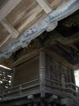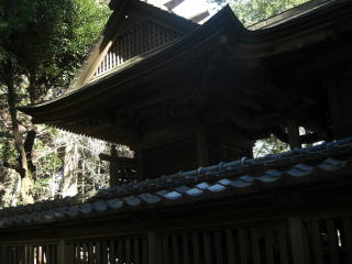 大胡神社は南口の入口から参道正面も含め、社殿の回りが鬱蒼とした木々に覆われている。ただ社殿の隣の神楽殿の前には広い空間があり、その場所のみは太々神楽の関係だろうが日当たりが良い。今まで多数の神社を見てきたが、参道から見て社殿と神楽殿がほぼ並んで建っているいる配置も珍しく、社殿は緑が多いので日陰部分が多いのに対して、神楽殿は広い空間が前にあり、社殿の陰に対して神楽殿の陽の、その色彩のコントラストの違いが印象に残った参拝だった。