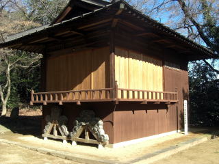 拝殿の右側にある神楽殿 社殿の右奥にある神興庫の類だろうか。