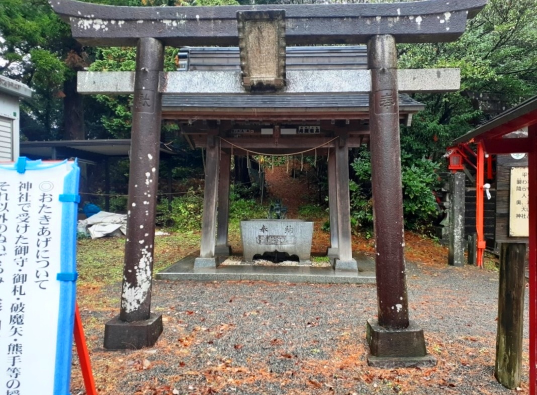 案内板の左側には鳥居があり、その先には手水舎がある。
