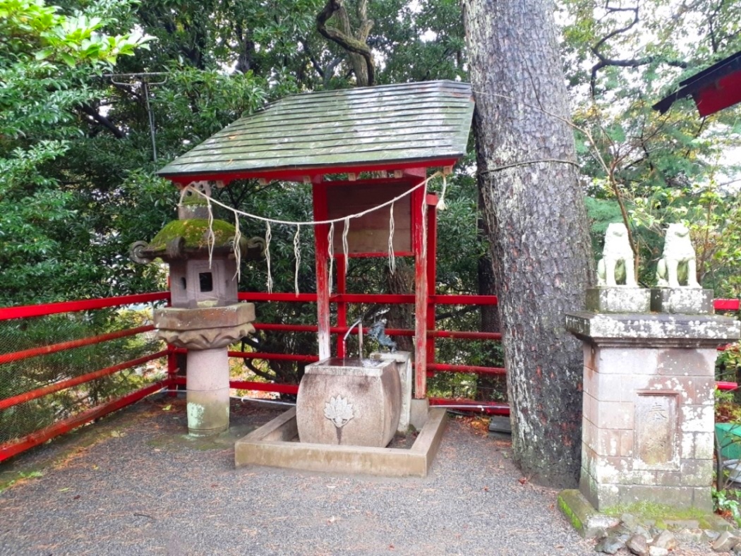 この手水舎の奥から、斜面上に祭られている境内社群に向かう道があるようだが、