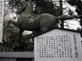 応仁の乱の西軍の指揮を執った山名宗全の祖が当社を造営した山名義範である。義範は新田氏の祖、新田義重の子でこの山名郷に入り山名氏の祖先となった。史書(吾妻鏡)には随所に名が記され、源頼朝の配下として活躍した。この神馬像は全国の山名氏の末裔が奉納したもので神馬は西国を向いている。