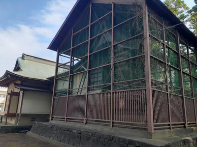 ネットで覆われている為見ずらいが、一間社流造りの本殿には精巧な彫刻が施されている。