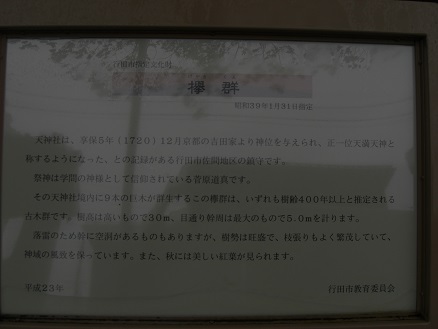 祭神は学問の神様として信仰されている菅原道真です。その天神社境内に9本の巨木が群生するこの欅群は、いずれも樹齢400年以上と推定される古木群です。樹高は高いもので30m、目通り幹周は最大のもので5.0mを計ります。落雷のため幹に空洞があるものがありますが、樹勢は旺盛で、枝張りもよく繁茂していて、神域の風致を保っています。また、秋には美しい紅葉が見られます。