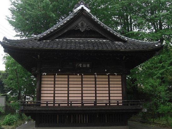 佐間天神社社殿は南向き故に神門に対して横向き 神楽殿