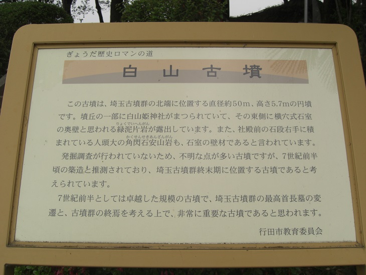 この古墳は、埼玉古墳群の北端に位置する直径約50m、高さ5.7mの円墳です。墳丘の一部に白山姫神社がまつられていて、その東側に横穴式石室の奥壁と思われる緑泥片岩が露出しています。また、社殿前の石段右手に積まれている人頭大の角閃石安山岩も、石室の壁材であると言われています。